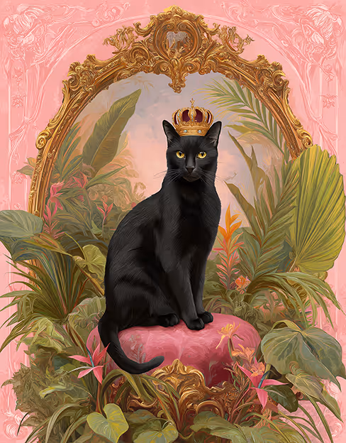 Prompt: A majestic black cat wearing a golden crown, seated on an ornate velvet throne, surrounded by lush tropical plants, elegant regal portrait style