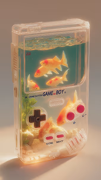 Prompt: A Gameboy with a fish tank, made of translucent bubblegum pink plastic. Decorated with holographic and glittery Y2K-style stickers.