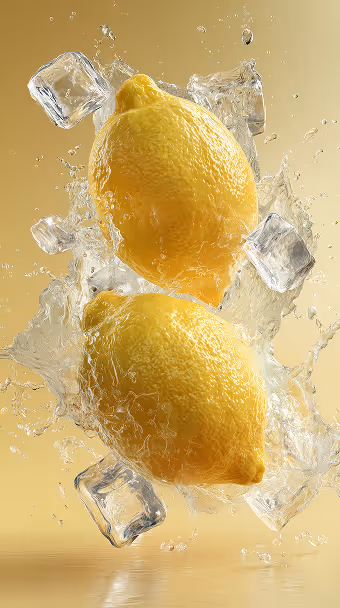 Prompt: two lemons colliding mid-air with a burst of juice and ice shards flying around them, soft pale yellow background, ultra-detailed textures, dramatic splash effects