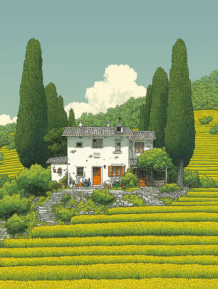 Prompt: Small Italian house on a winery, rustic painting